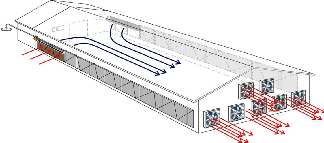 縱向通風(fēng):通過(guò)風(fēng)機(jī)冷效和濕簾降溫。通風(fēng)系統(tǒng)的計(jì)算應(yīng)根據(jù)豬只體重,階段以獲得需求的風(fēng)速。